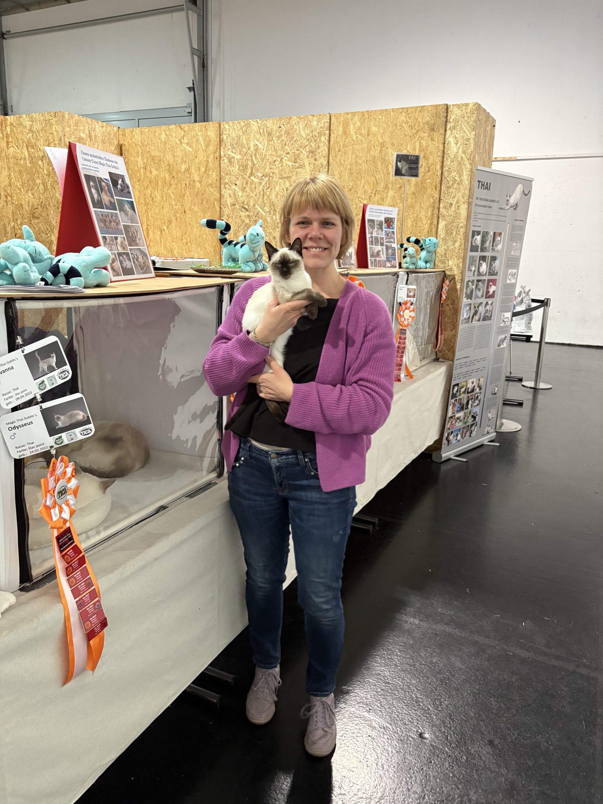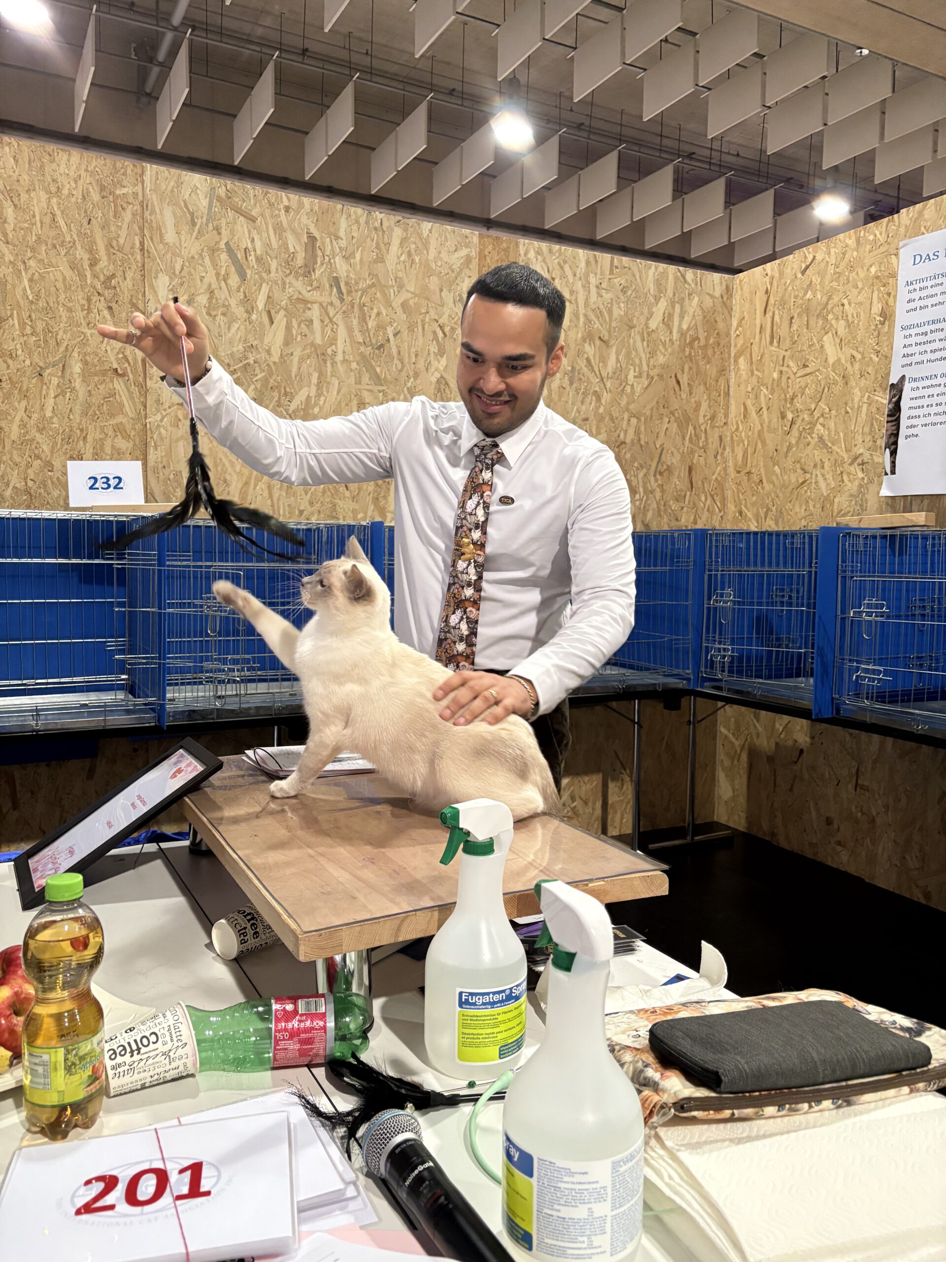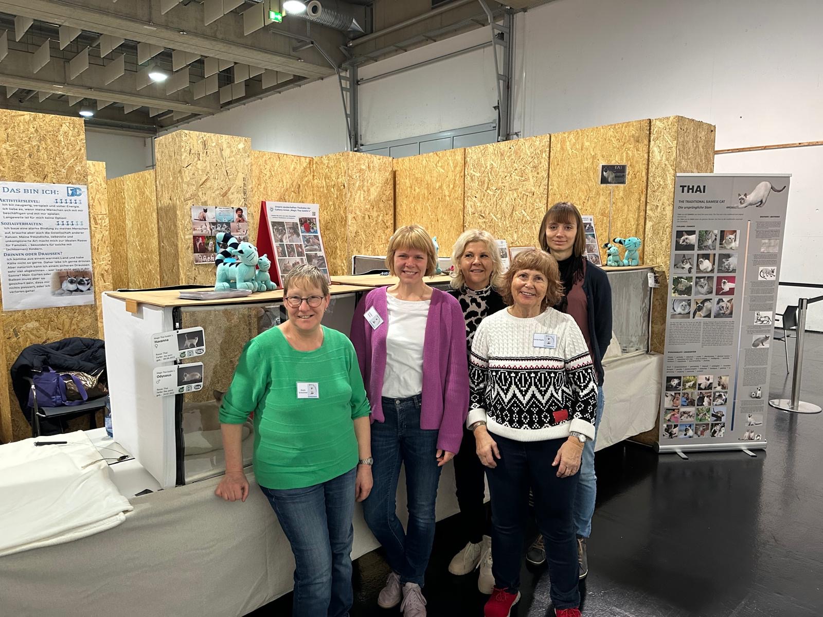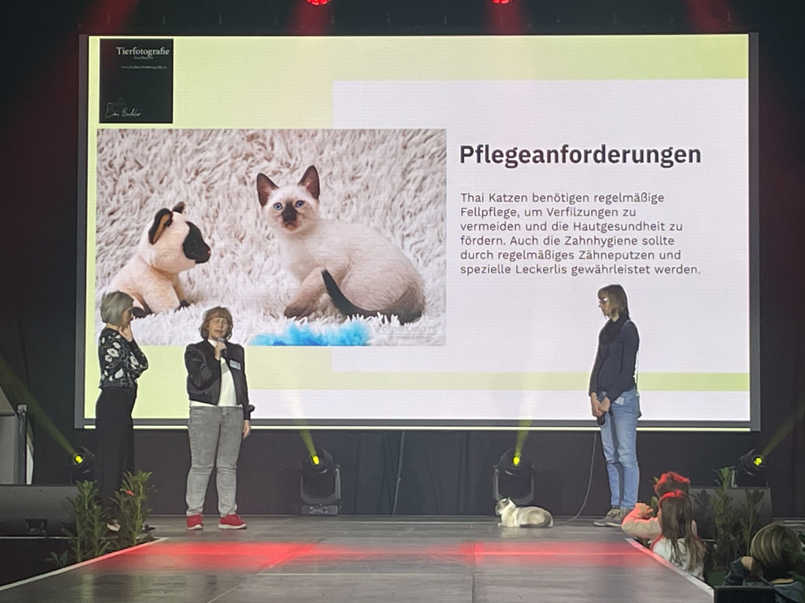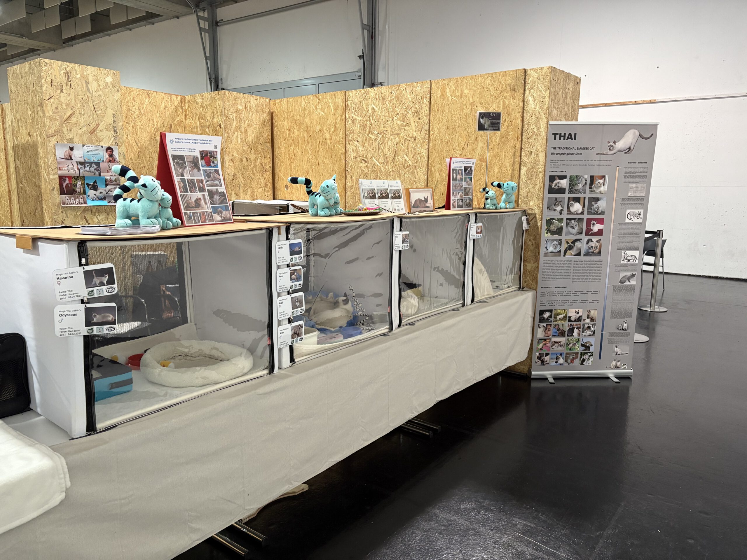Am Freitag dann bauten wir unseren Stand mit vielen Informationen rund um unsere Thaikatzenzucht auf und gestalteten für die Besucher der Tiermesse einen ansprechenden Stand. Infoflyer, Plakate, Visitenkarten, Fotos, kleine Werbegeschenke und Katzendeko schmückten unsere Ecke. Kräftig unterstützt wurden wir natürlich von unseren Samtpfoten, die sich neben dem Richten gerne dem großen Publikum präsentierten, sich Streicheleinheiten abholten und sogar für die Tageszeitung und das Fernsehen posierten. Wir waren also gut unterwegs an diesem dreitägigen Messe- und Ausstellungswochenende und tingelten zwischen Richtern und Interessierten hin und her. Viele schöne Gespräche mit neuen und alten Züchterfreunden, Ausstellern und Besuchern bereicherten diese Tage.