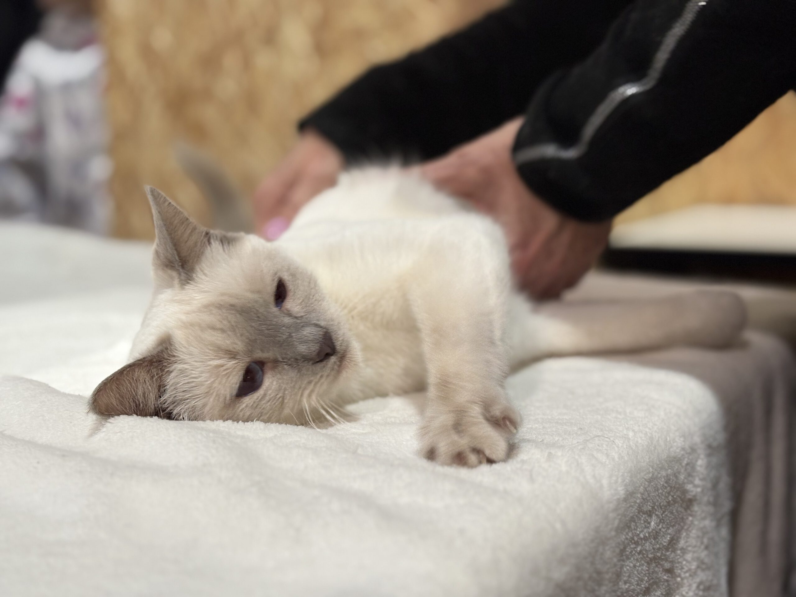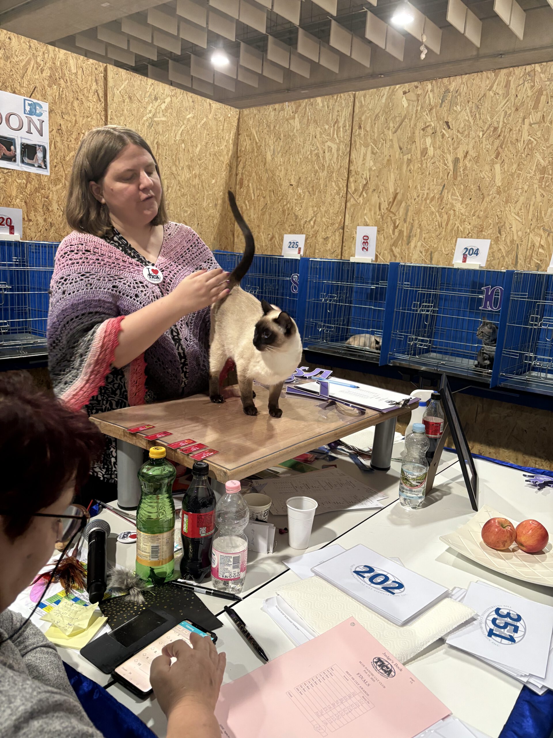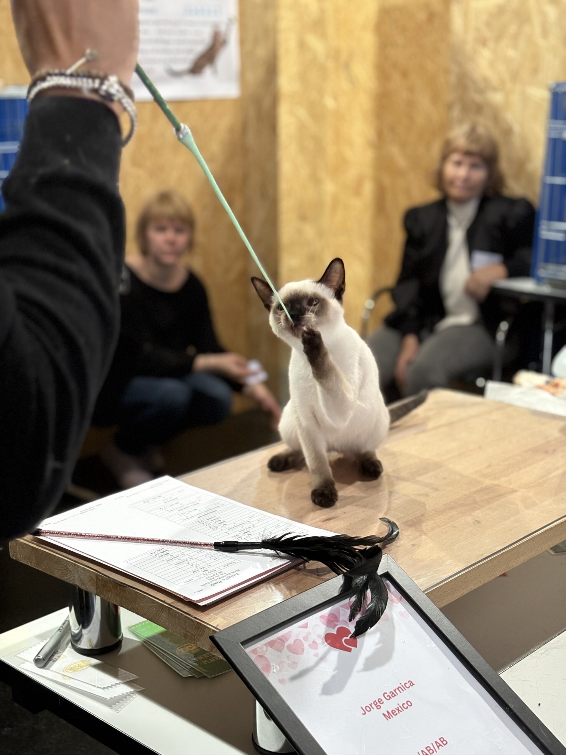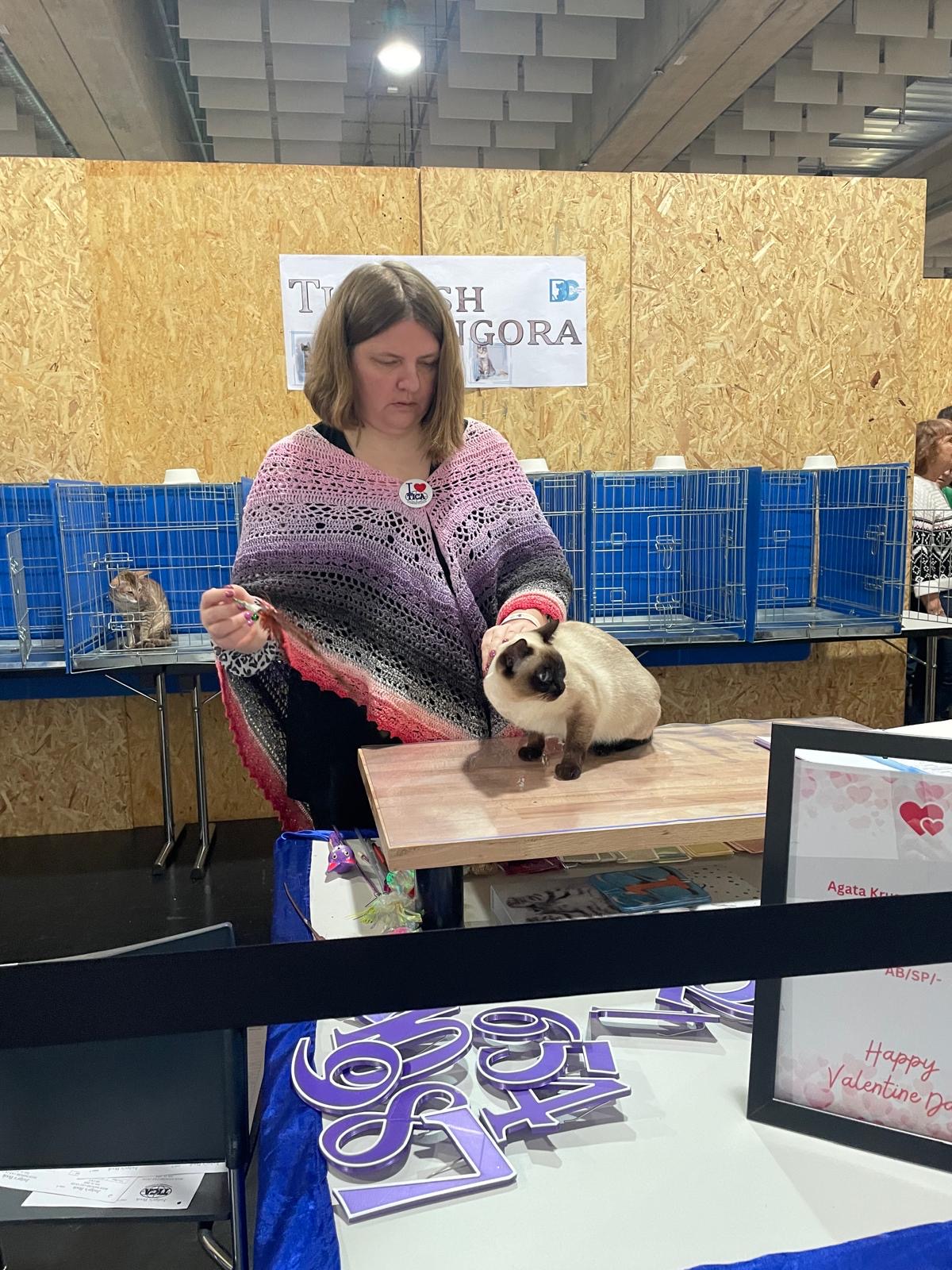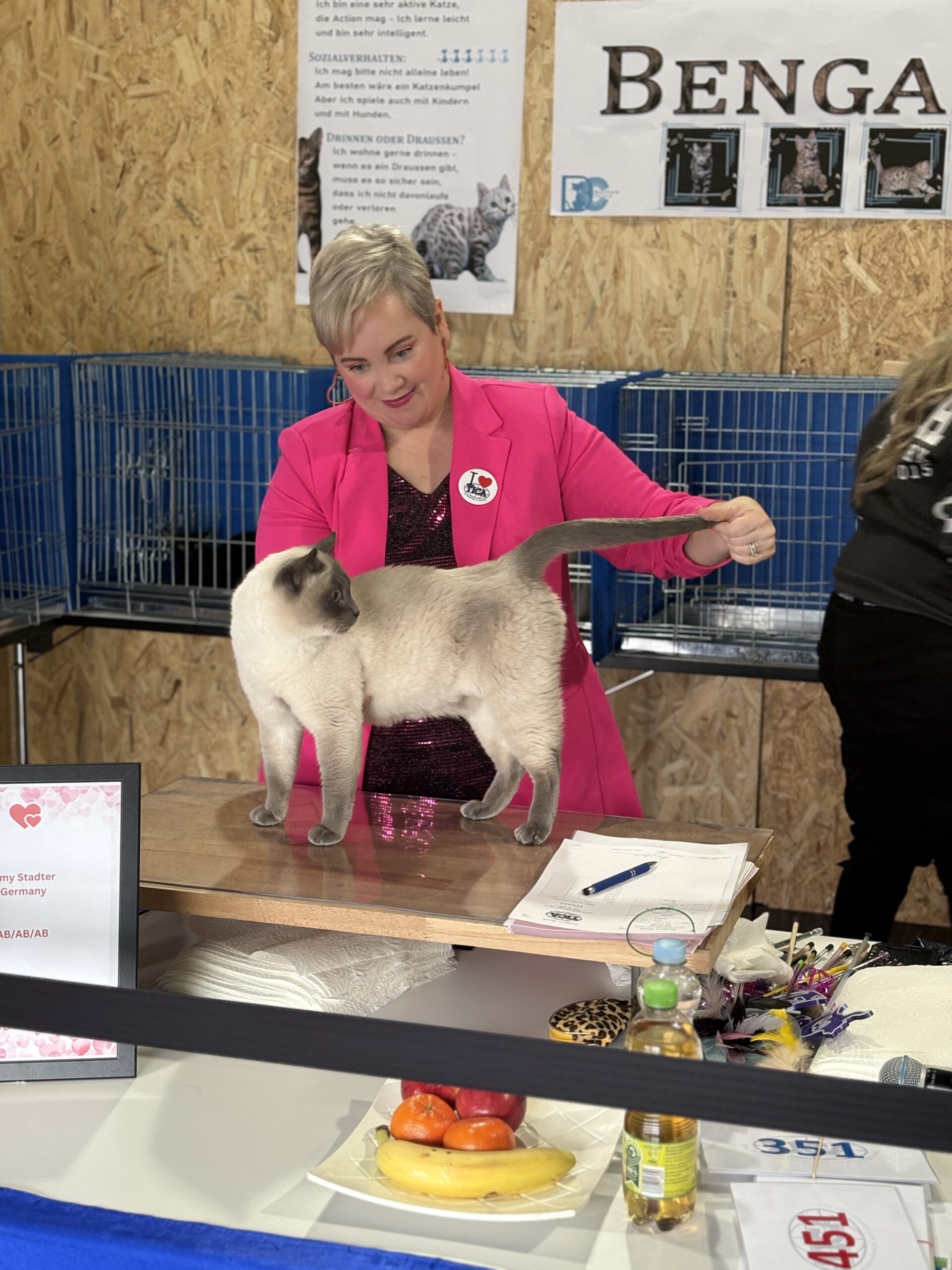 Am Freitag dann bauten wir unseren Stand mit vielen Informationen rund um unsere Thaikatzenzucht auf und gestalteten für die Besucher der Tiermesse einen ansprechenden Stand. Infoflyer, Plakate, Visitenkarten, Fotos, kleine Werbegeschenke und Katzendeko schmückten unsere Ecke. Kräftig unterstützt wurden wir natürlich von unseren Samtpfoten, die sich neben dem Richten gerne dem großen Publikum präsentierten, sich Streicheleinheiten abholten und sogar für die Tageszeitung und das Fernsehen posierten. Wir waren also gut unterwegs an diesem dreitägigen Messe- und Ausstellungswochenende und tingelten zwischen Richtern und Interessierten hin und her. Viele schöne Gespräche mit neuen und alten Züchterfreunden, Ausstellern und Besuchern bereicherten diese Tage.