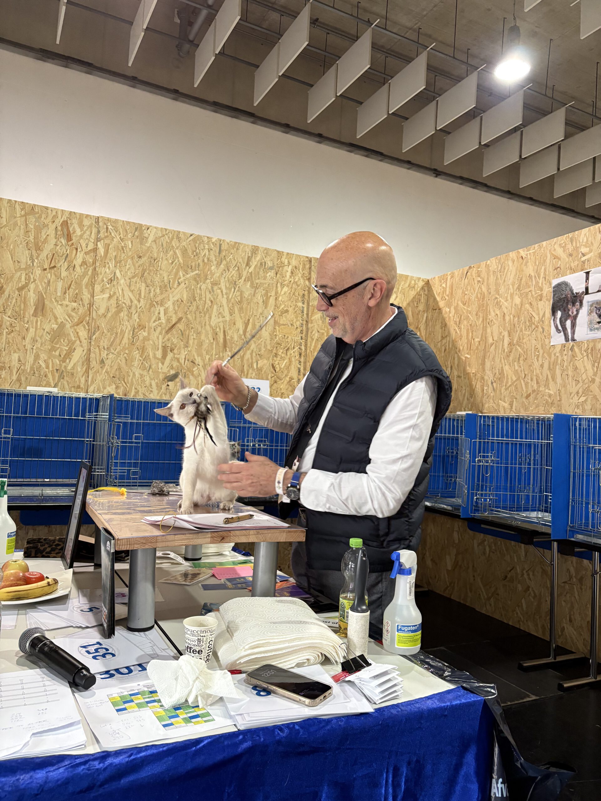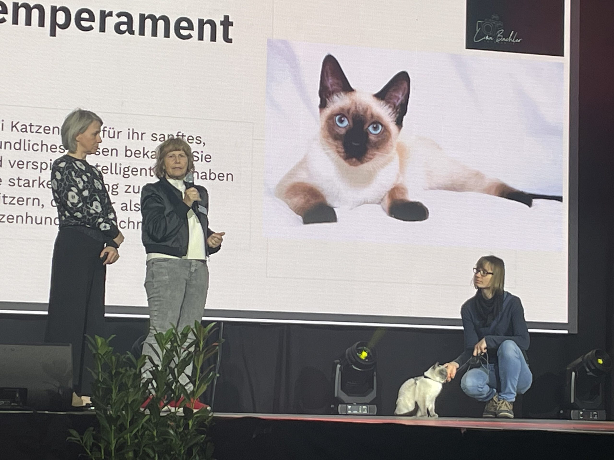 Für einen Rassevortrag waren Carola und Mandy mit Abrax mitunter auch auf der Bühne. Anschließen war unser Stand von noch mehr Menschen umringt. Meine beiden Thaimädchen waren besonders von den höflichen und lieben Kindern beglückt. Wenn wir mal etwas Luft hatten, stärkten wir uns mit sehr leckerem Latte Macchiato oder Käse aus der Messehalle.