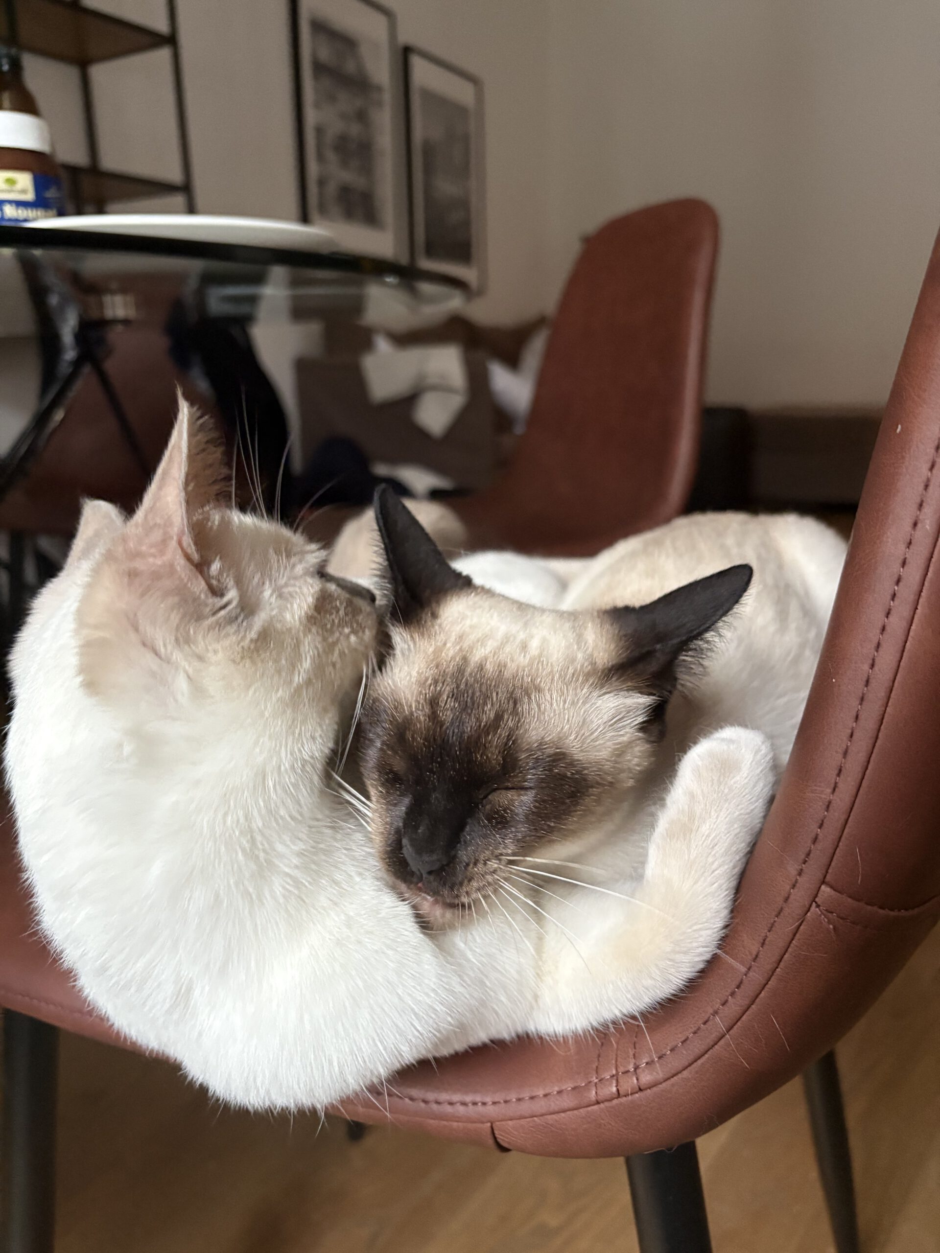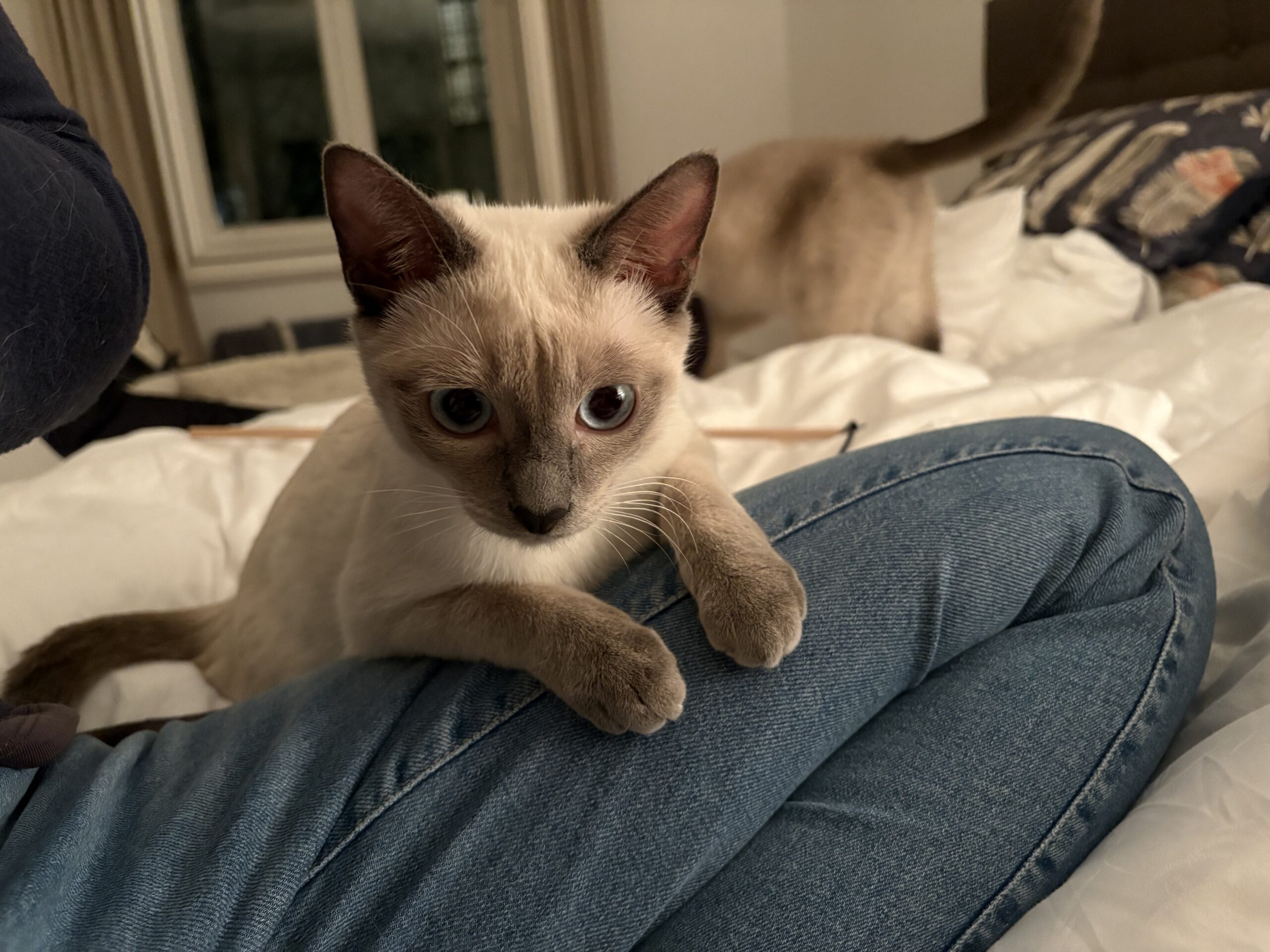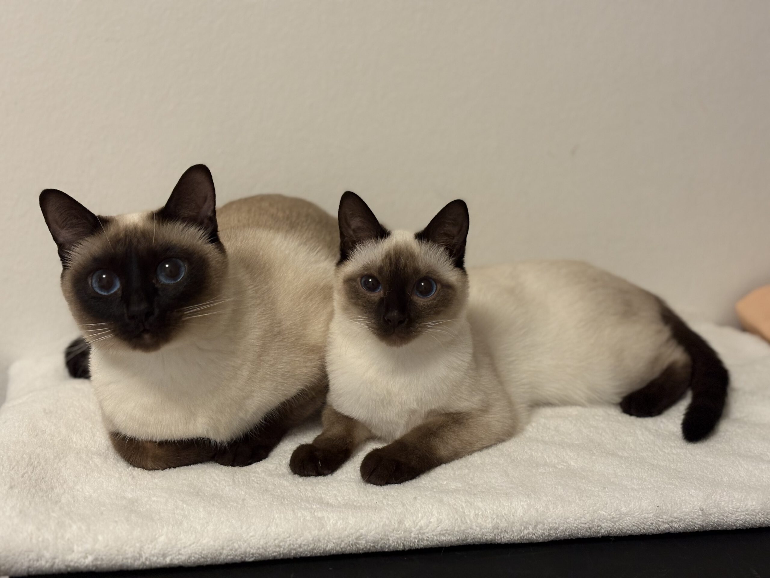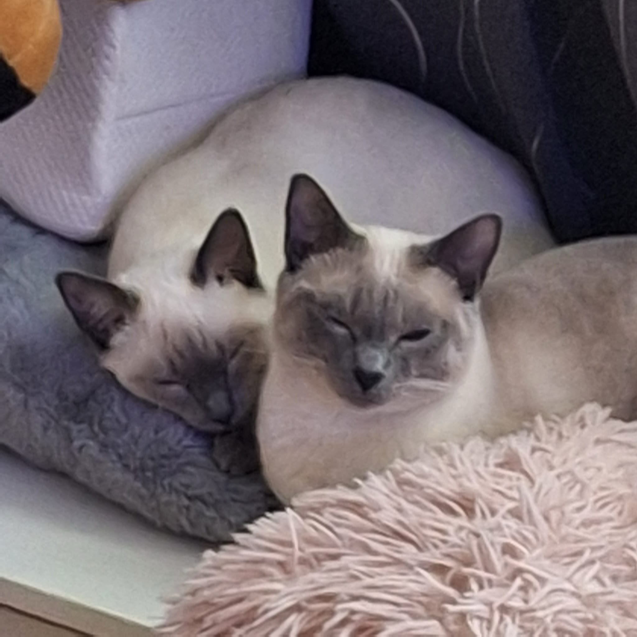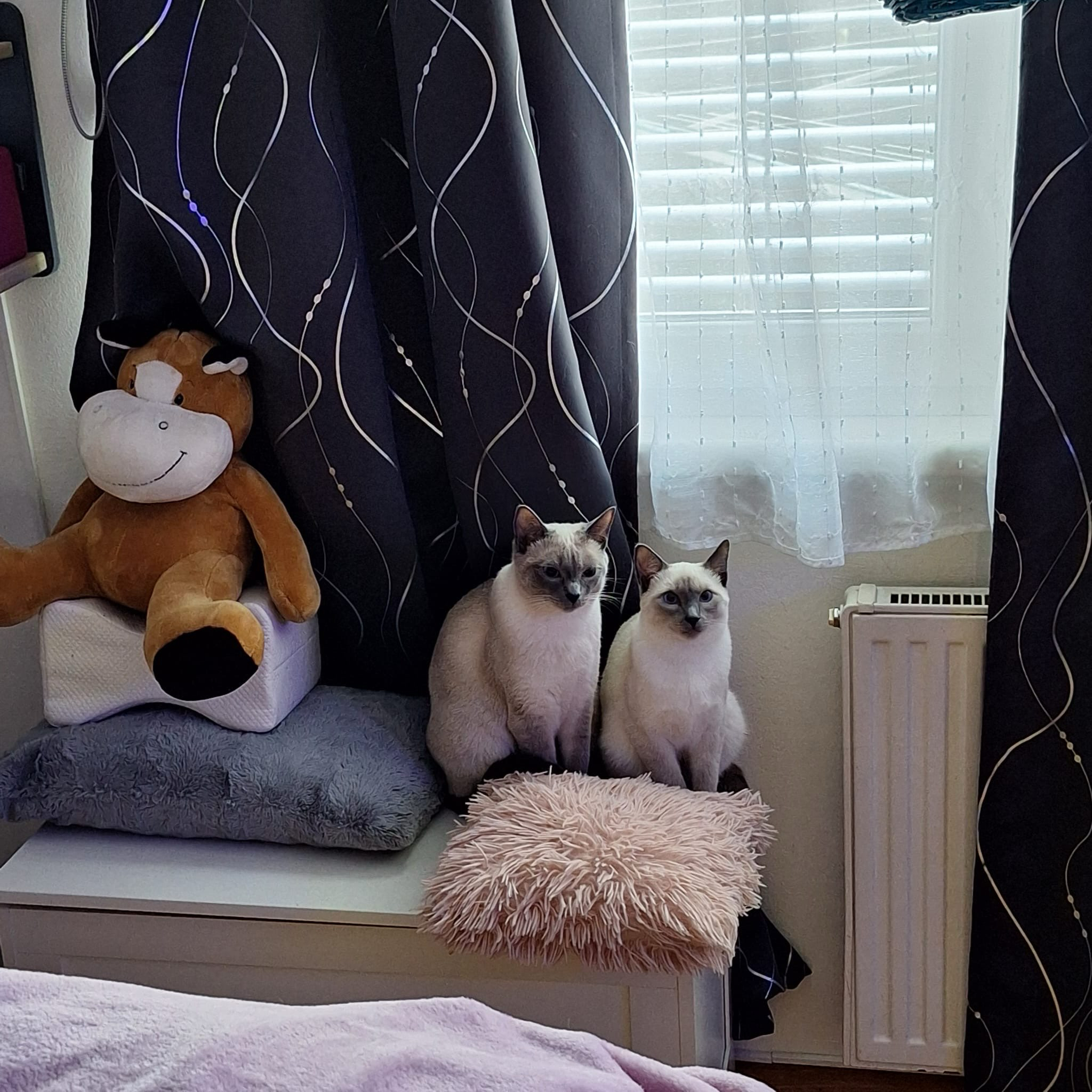 Die liebe und bescheidene Wera benahm sich anfangs etwas perplex und distanziert über den so plötzlich aufgetauchten Fremden. Hinnerk, als zurückhaltendes Katzenkind unter seinen Geschwistern, präsentierte sich in seinem neuen Zuhause sofort neugierig, aufgeweckt und taff. Es dauerte nur wenige Tage und die beiden wuchsen zu einem echten Dream Team zusammen. Jetzt wird gerne alles geteilt, Bett, Kuschelnest, Kratzbaum, Streicheleinheiten. Hinnerk wächst und gedeiht und wird ein stattlicher Thaikater mit der süßen und lieben Thaikatze Wera an seiner Seite.