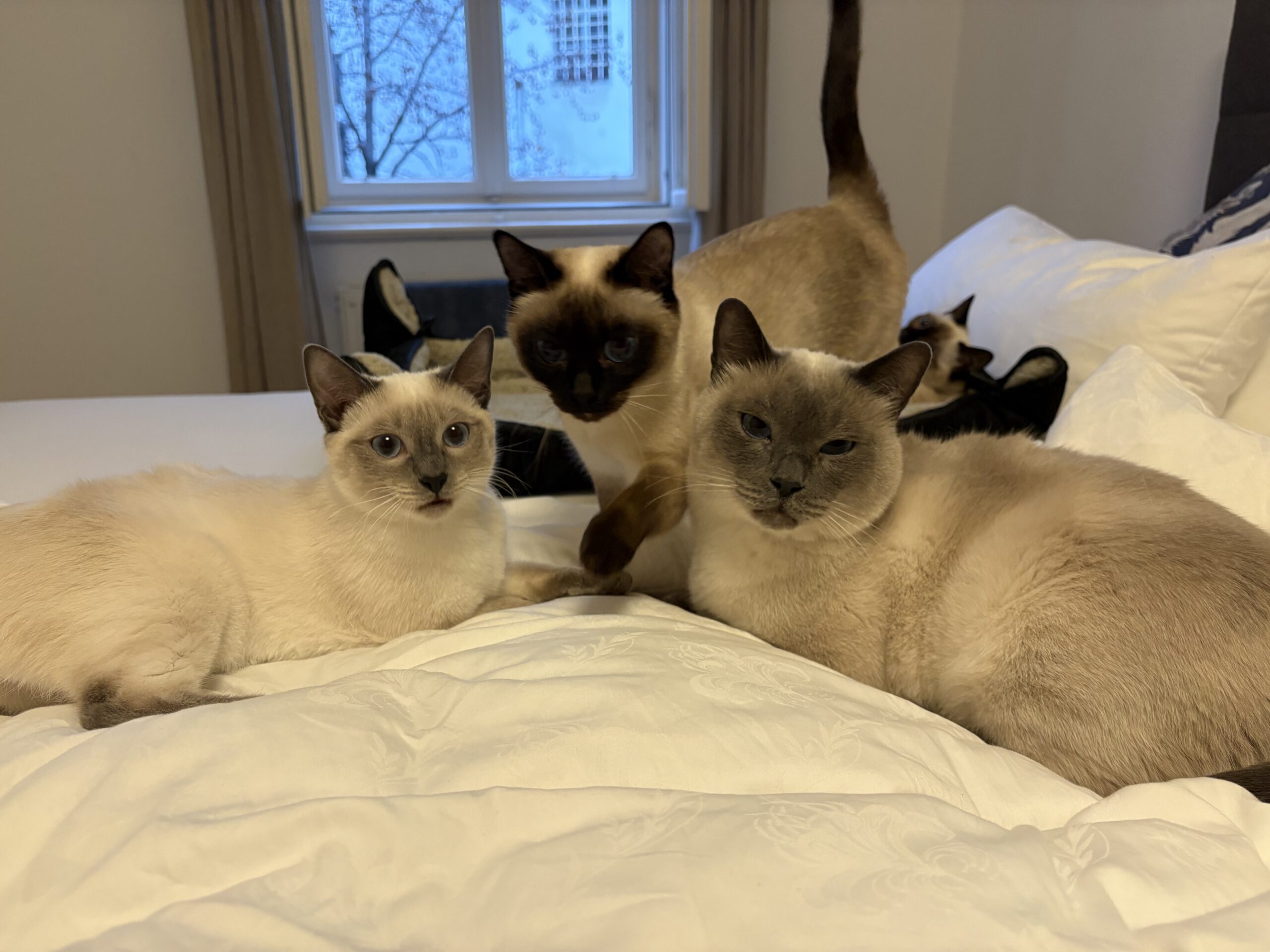 Die Katzen unterdessen erkundeten die schöne Wohnung und es dauerte gar nicht lange, da liefen sie – obschon aus unterschiedlichen Haushalten und wenigen Fauchern, fast alle miteinander durcheinander. Nach so einer langen Fahrt musste natürlich getobt, erkundet und gespielt werden. Trotzdem ließen es sich Salsa und Wera nicht nehmen und kuschelten sich für die Nacht wieder zu mir ins warme Bett.